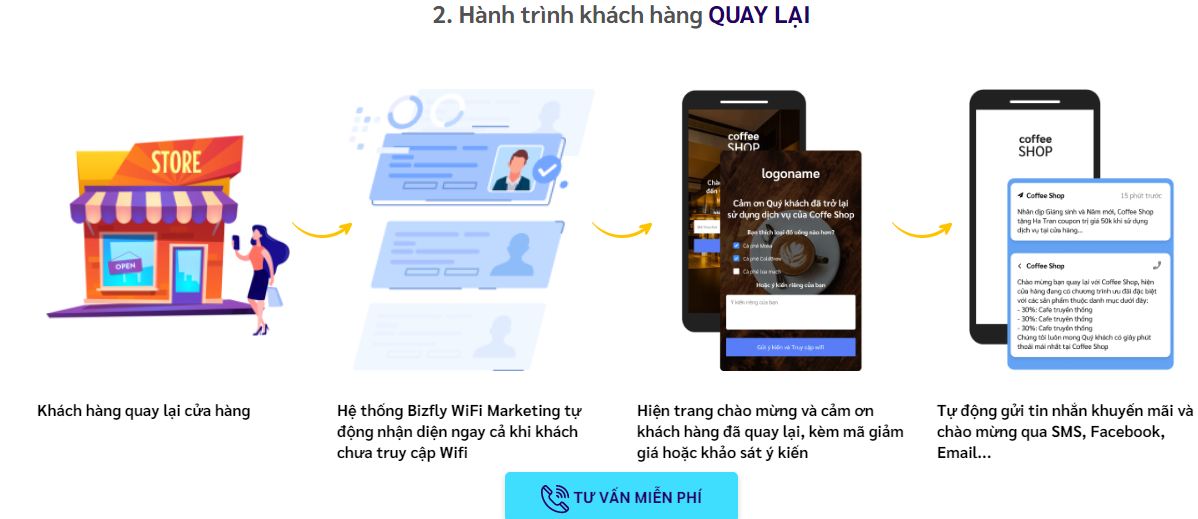 "Moma WiFi Marketing Giải pháp Marketing & Chăm sóc Khách hàng tự động thông qua WiFi. Moma WiFi Marketing giúp doanh nghiệp chăm sóc khách hàng qua 5 điểm chạm: - Khách hàng đến và truy cập Wifi miễn phí. Hệ thống tự động lưu trữ, nhận diện tình trạng khách hàng. - Khách hàng đăng nhập vào Wifi qua kịch bản được xây dựng sẵn. Cửa sổ trang hiển thị nội dung chào mừng, kèm theo thông tin khuyến mãi (nếu có). - Hệ thống tự động lưu trữ và bảo mật thông tin khách hàng vào CRM để sử dụng cho các chiến dịch quảng bá sản phẩm và chăm sóc khách hàng. - Tự động điều hướng truy cập đến những địa chỉ website doanh nghiệp muốn khách hàng theo dõi. -Moma Wifi Marketing tự động gửi mã giảm giá, ưu đãi, lời chúc mừng vào các dịp đặc biệt qua SMS, Email,... đến khách hàng."