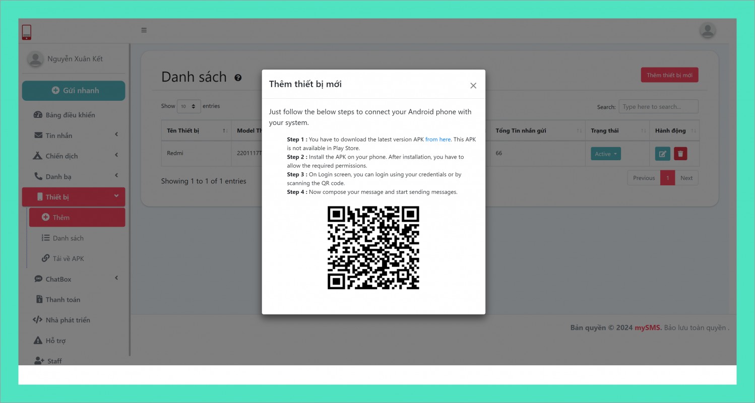- app: "tải APK và cài đặt từ link đã đưa" như hình ấy https://mysms.vn/uploads/mysms-client-v1.4.1.apk